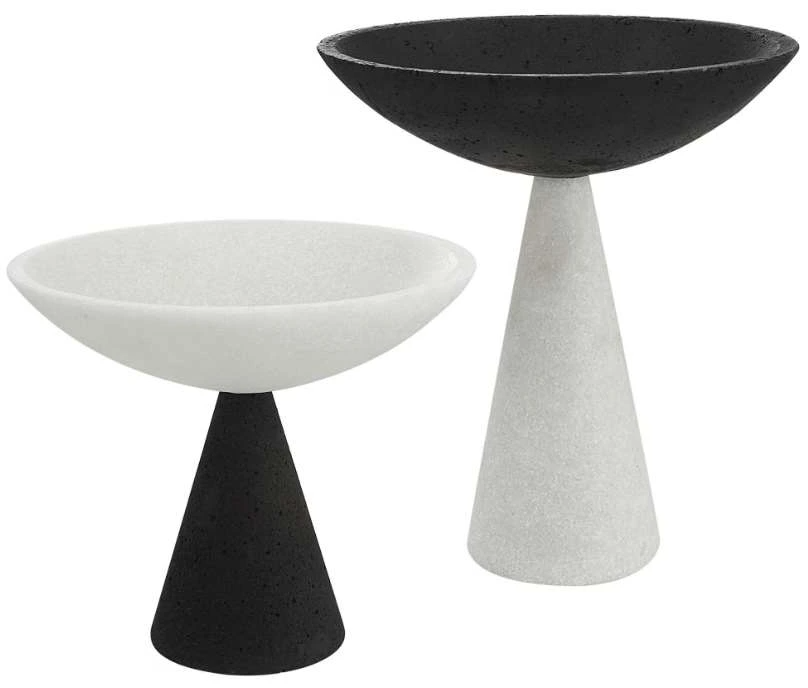 A set of two modern pedestal bowls is crafted from a striking black and white man-made stone that accurately replicates the look of Thassos marble. Make a bold statement by incorporating this stunning home decor into your home.Read More