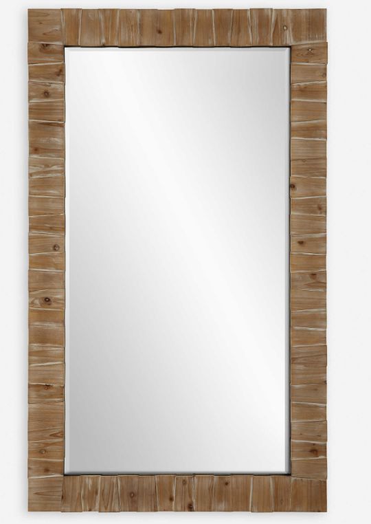 Perfect addition to any coastal cottage, this oversized mirror features overlapped slabs of solid fir wood creating an alternating pattern, accented with a subtle light gray wash. Mirror has a generous 1 1/4" bevel. May be hung horizontal or vertical.Read More
