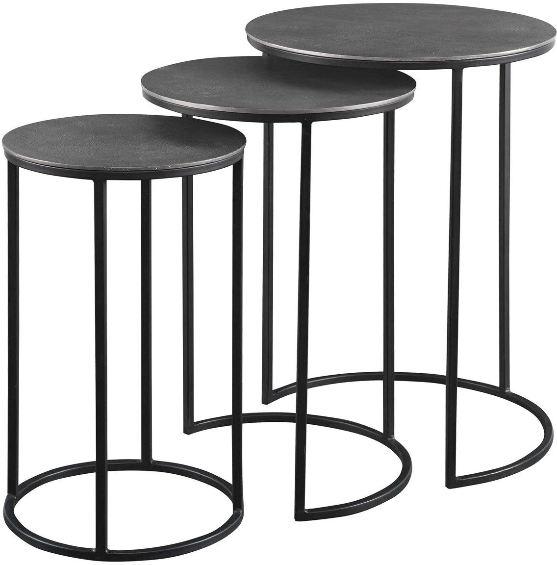 Set of three functional nesting tables constructed in an aged black iron, featuring a textured cast aluminum slab top finished in a plated antique nickel.Read More