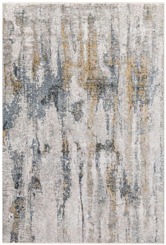 This machine-woven rug features an abstract design in tones of light beige, cream, denim blue, and gray, constructed from lustrous polyester. Make a bold statement by incorporating this stunning rug into your home.Read More